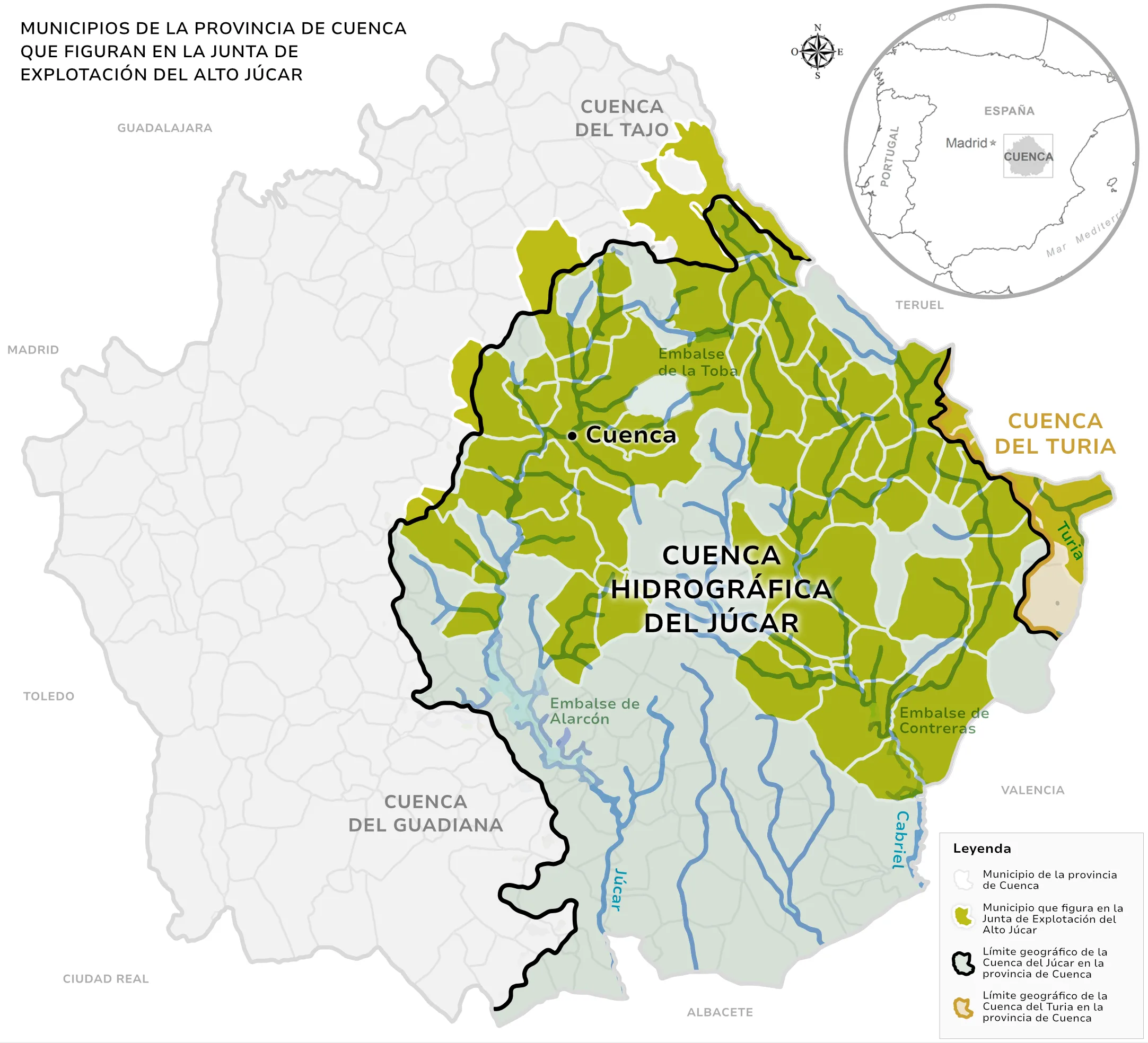 El ámbito territorial de la Comunidad General abarca toda la Cuenca Hidrográfica del Alto Júcar, terminos municipales desde las presas de Alarcón y Contreras hacia los nacimientos, y Cuenca Hidrográfica del Turia en la provincia de Cuenca.